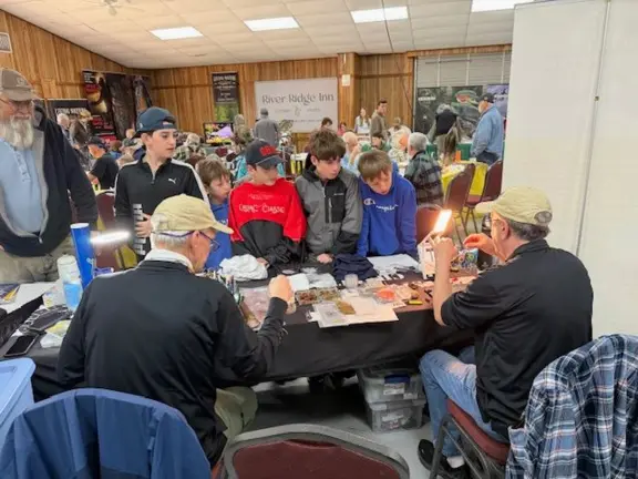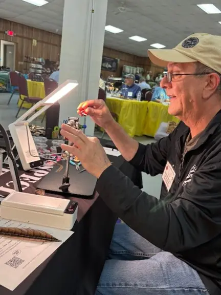 A group of about nine members attended the International Sowbug Roundup in Mountain Home Arkansas March 26-28, 2026. This is probably the largest fly tying event in the Midwest. We had a nonprofit table throughout the event and we were able to interact with many people, educating them about our program. Several of us tied flies and gave some away to people who visited our table. Additionally, we got several donations and we were able to recruit several expert guest fly tyers for our Tuesday evening zoom meetings. We all were able to visit with other tyers and we learned a lot! In addition to hanging out at the convention, we were able to get in some fishing on the world-class Norfork tailwater every day. Lots of fish were caught, and everyone caught at least one. Most important was that we all got to spend time together and we had some great group meals! As one member put it, “The best takeaway from Sowbug was simply getting away with some amazing humans to forget the hustle and bustle of life to enjoy each others company…and to catch a few fish.”